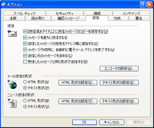 | メーリングリストは、「HTML形式」を受け付けられません。 アウトルックエクスプレスのメニューバーから「ツール」をクリックして「オプション」ウインドウを開きます。 「送信」タグをクリックして、「メール送信の形式」を、「HTML形式」ではなく「テキスト形式」のラジオボタンをクリックしてください。 これで設定は完了です。 メーリングリストでは、添付ファイルはできません。 |